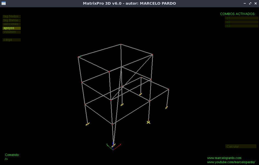 Hola Marcelo, ya revisé esta última versión del MatrixPro3d (Versión 6.0), y funciona perfecto!. Solo estaríamos en espera, si se puede, de un video-tutorial para practicar conjuntamente contigo algún ejercicio utilizando los nuevos comandos (nuevo botón “Calcular”, elementos en volumen, seccionPlaca, secciones “W”, sección “costanera”, etc… Saludos.