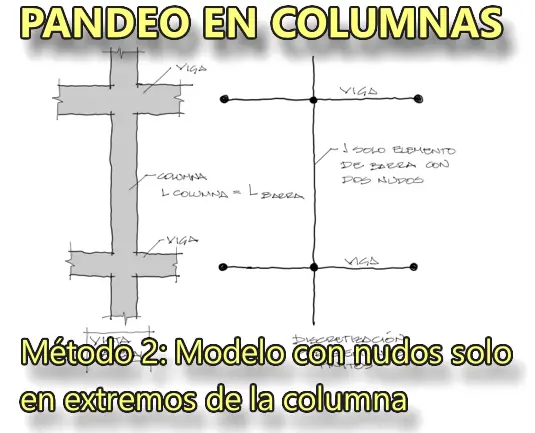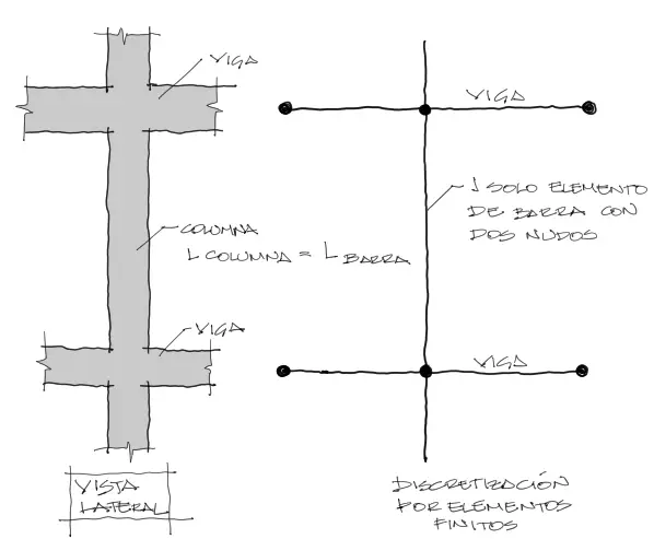 El problema es que, como mencioné en la introducción al tema de columnas sometidas a pandeo, normalmente las columnas en su diseño se modelan con un solo elemento de barra de extremo a extremo, con dos nudos (uno en cada extremo). Y muchas veces esto no es un capricho. El programa muchas veces asume que un elemento de columna entre dos niveles estará modelado por un solo elemento de barra ya que así el programa puede usar la lontigud de ese elemento de barra como la longitud de la columna, y también detectar las intersecciones con vigas u otras columnas en los extremos, como se ve en la figura siguiente.