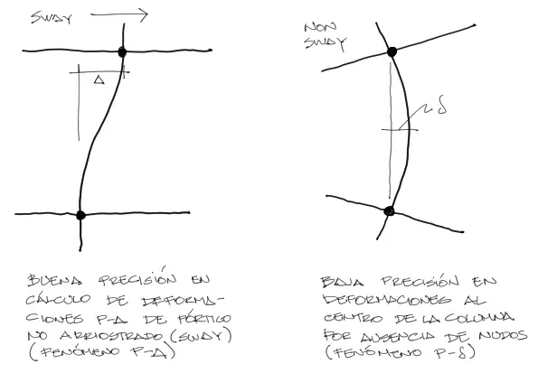 1) Al usarse solo 2 nudos por columna, el análisis P-Delta es poco preciso.